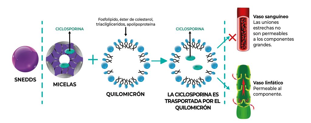 La formación de la nanoemulsión previene la hidrólisis enzimática de la ciclosporina. En el intestino, la nanoemulsión es absorbida por el enterocito y evita la acción de la glicoproteína-P, asegurando una alta absorción. Dentro del enterocito, la ciclosporina se une a los quilomicrones, lo que le permite eludir el metabolismo de primer paso y alcanzar concentraciones plasmáticas terapéuticas en menor tiempo.