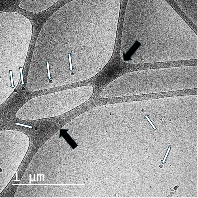 Fig. 2. Micrografía por CRYO-TEM. Se observan tirantes de carbono (flechas negras) y gotas del producto (flechas blancas) de 44.9–62.9 nm.