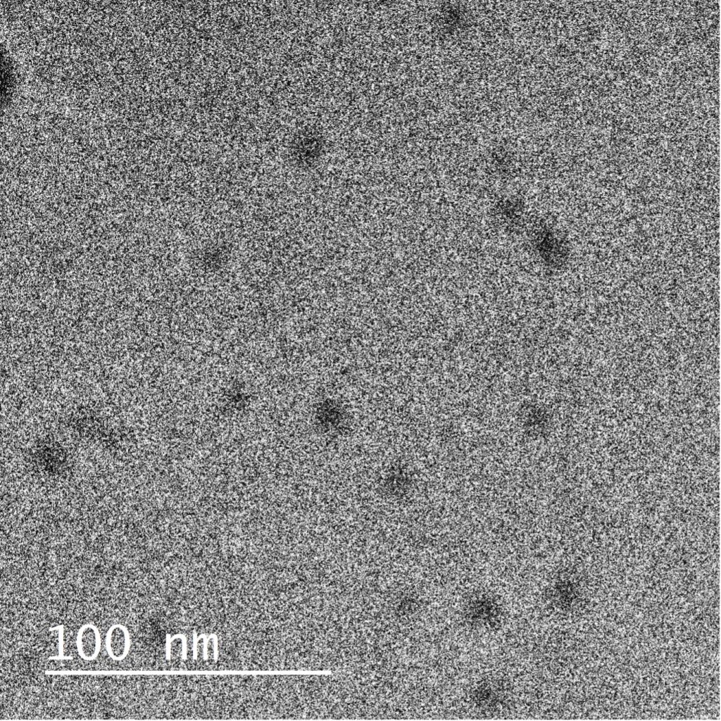 Fig. 3. Micrografía por CRYO-TEM. Se observan partículas circulares con un diámetro promedio de 12.9 nm.