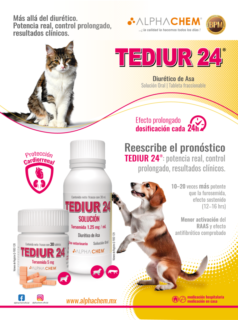 RESUMEN: La torsemida ha emergido como una opción terapéutica prometedora en el tratamiento de enfermedades cardiorrenales en medicina veterinaria. Este artículo presenta una revisión comparativa entre la torsemida y la furosemida, los dos principales diuréticos de asa utilizados en clínica veterinaria, destacando las ventajas farmacocinéticas, farmacodinámicas y clínicas de la torsemida. Con base en literatura actualizada y casos clínicos, se discute su aplicación en pacientes con insuficiencia cardiaca congestiva y síndrome cardiorrenal, proponiendo un cambio de paradigma terapéutico.