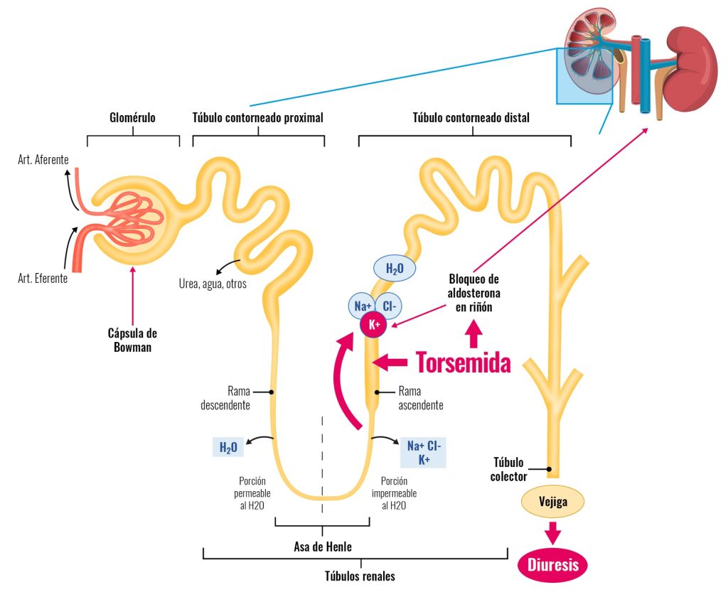 La torsemida permite una eliminación de líquido más eficaz sin afectar negativamente la perfusión renal. Al tener menor activación del sistema renina-angiotensina-aldosterona (RAAS), reduce la progresión de la disfunción cardiaca y renal. Además, su efecto antifibrótico sobre el miocardio ayuda a preservar la estructura ventricular, mejorando el pronóstico en pacientes con ICC.