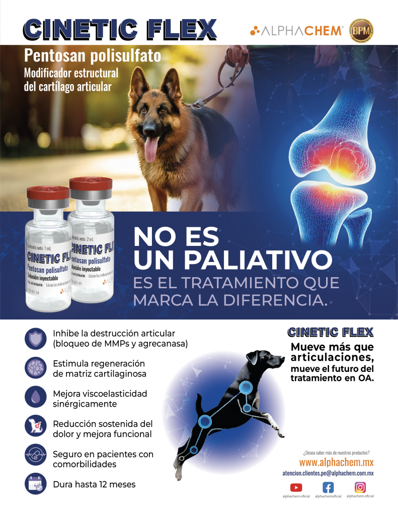 Cinetic Flex la formulación para el manejo de la osteoartritis, disponible en dos concentraciones 3% y 6% lo que permite ajustar la dosificación con precisión según el peso. Esta presentación facilita el diseño de terapias personalizadas y multimodales, tanto en fases iniciales como en pacientes avanzados con comorbilidades.