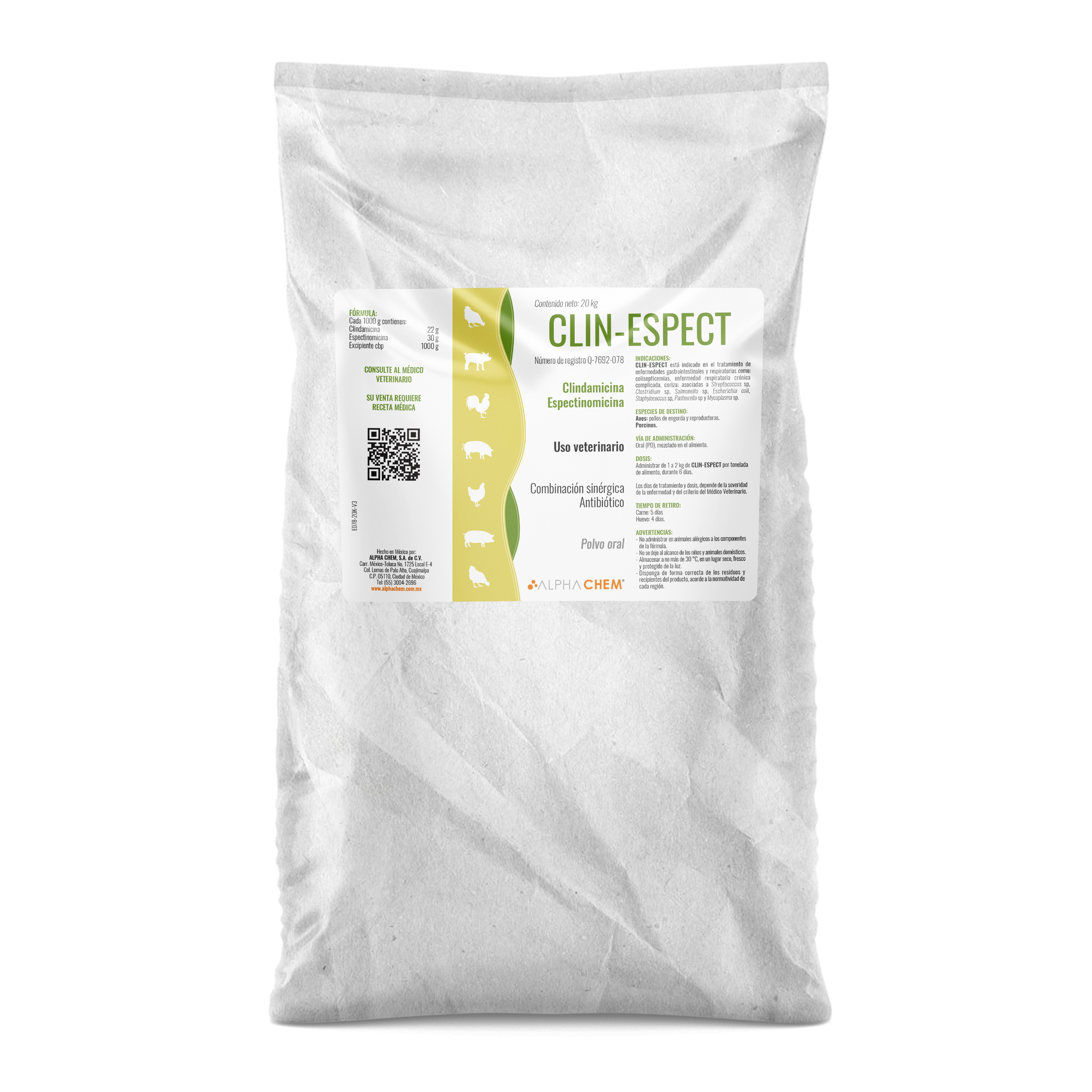 CLIN-ESPECT está indicado en el tratamiento de enfermedades gastrointestinales y respiratorias como: colisepticemias, enfermedad respiratoria crónica complicada, coriza; asociadas a Streptococcus sp, Clostridium sp, Salmonella sp, Escherichia coli, Staphylococcus sp, Pasteurella sp y Mycoplasma sp.