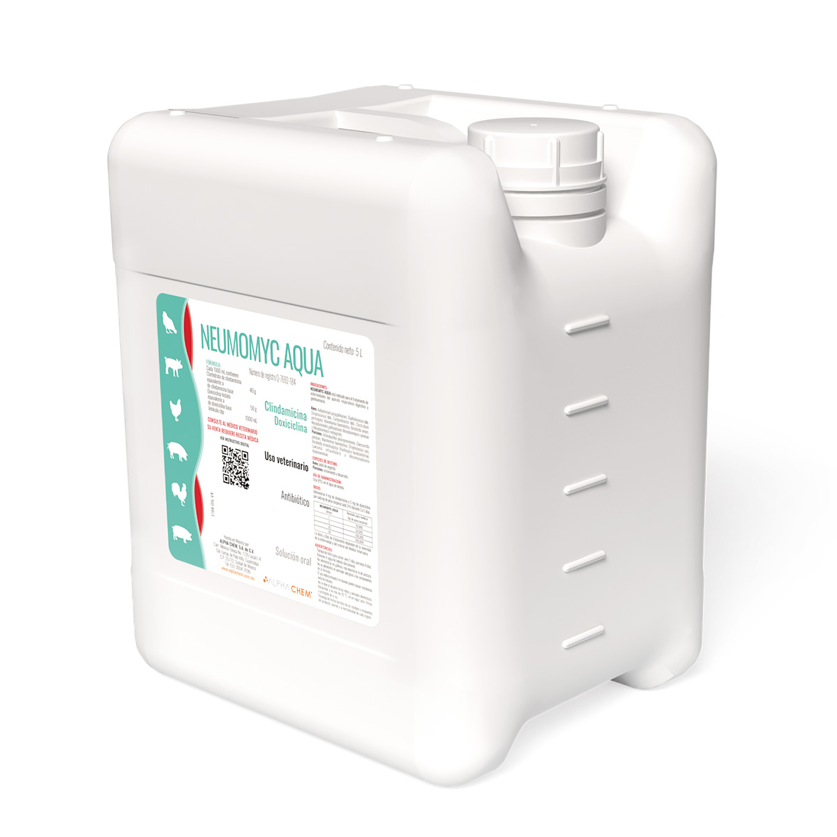 NEUMOMYC AQUA es una solución oral para dilución en agua de bebida, que contiene dos antibióticos de amplio espectro, Clindamicina y Doxiciclina, ambos bacteriostáticos que trabajan de manera sinérgica contra bacterias Gram positivas, Gram negativas, tanto aeróbicas como anaeróbicas, intracelulares y micoplasmas.